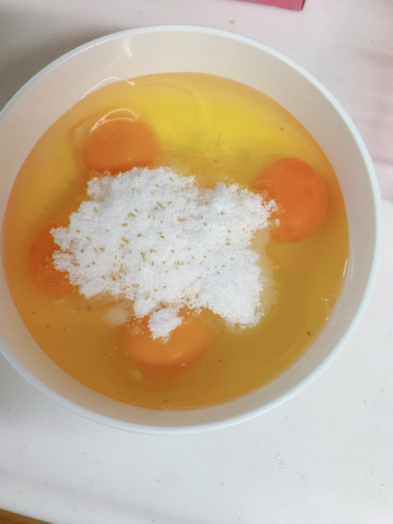卵5個にだしの素ひとつまみ、砂糖を大さじ3、マヨネーズ大さじ1入れます🧂