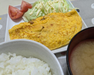 朝はオムレツと即席の梅しそ味噌汁っ(*´ω`*)